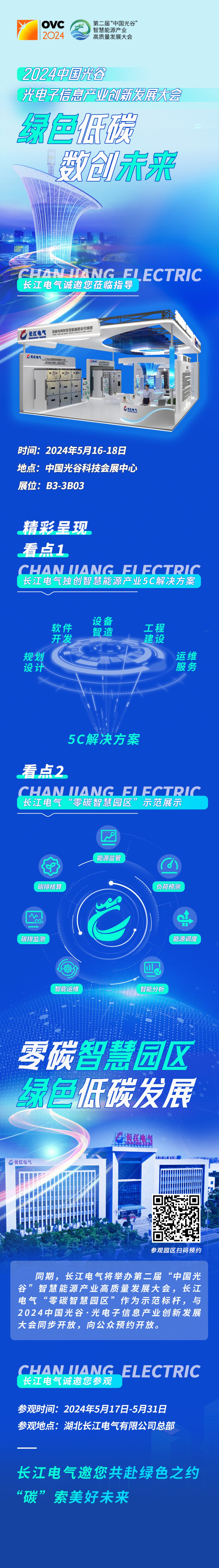 5月16日-18日,2024中国光谷·光电子信息产业创新发展大会将在中国光谷科技会展中心举行,长江电气将携智慧能源产业5C解决方案及“零碳智慧园区”示范案例展示,亮相本次大会。同期,长江电气将举办第二届“中国光谷”智慧能源产业高质量发展大会,长江电气“零碳智慧园区”正式启动,诚邀社会各界人士莅临参观!