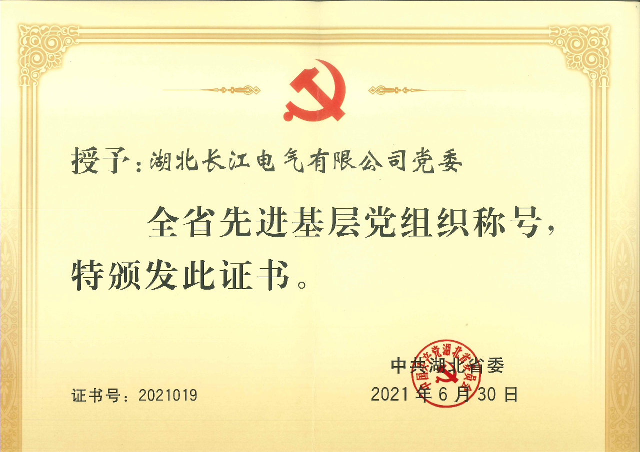 湖北长江电气有限公司党委荣获“湖北省先进基层党组织”称号。