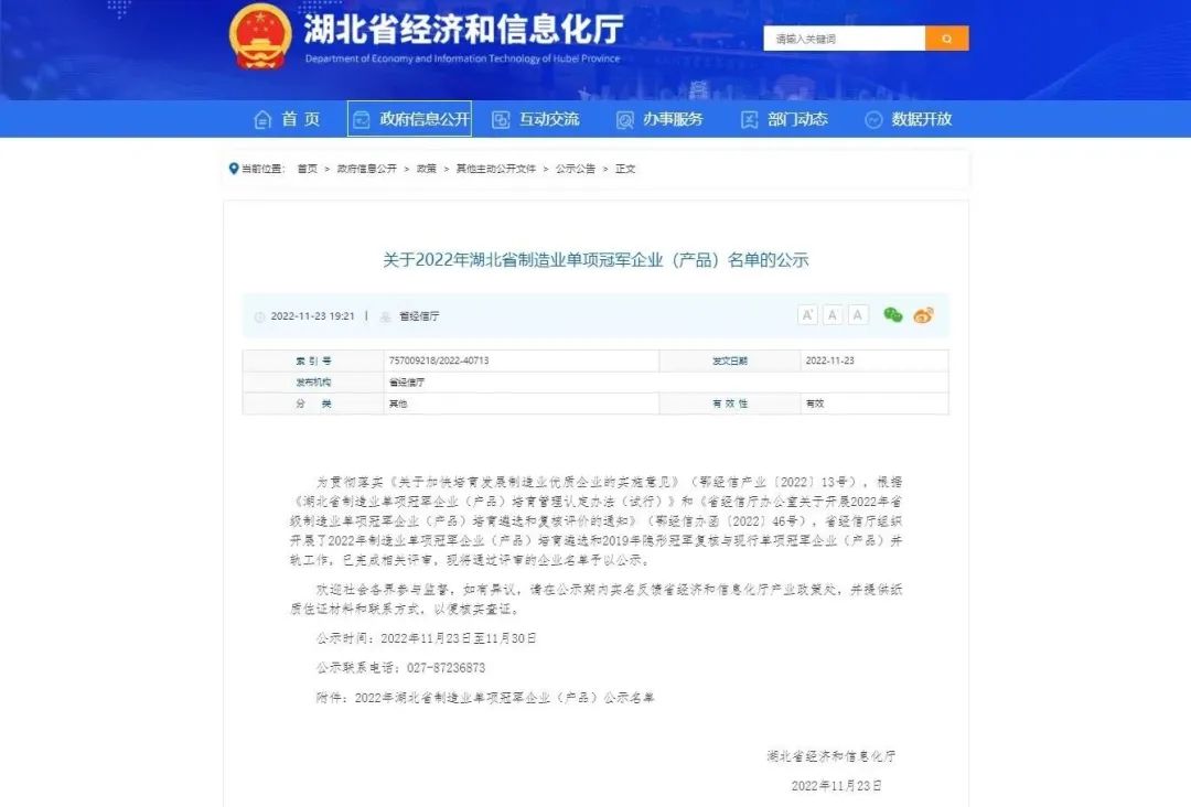 △湖北省经济和信息化厅“关于2022年湖北省制造业单项冠军企业(产品)名单的公示”